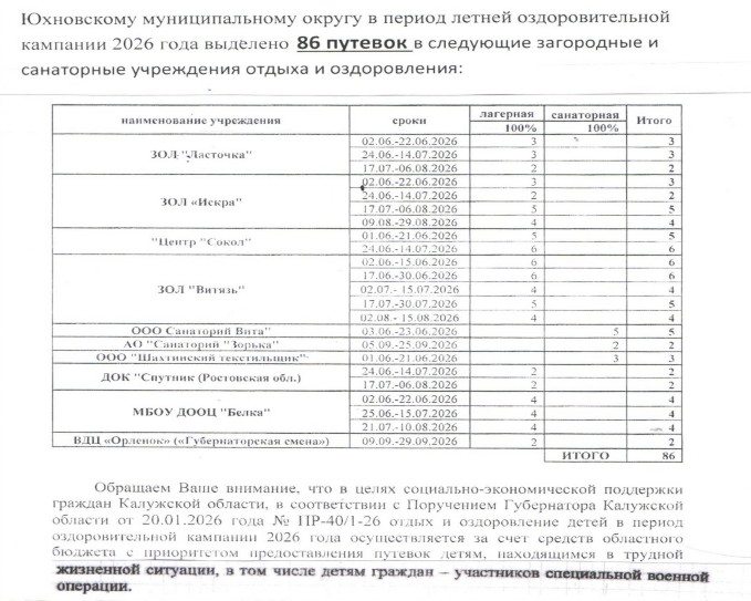 Распоряжение администрации Юхновского муниципального округа Калужской области от 10.03.2026 г. №36 "О мерах по организации отдыха, оздоровления, творческого досуга, занятости детей и подростков в 2026 году" (скачать)